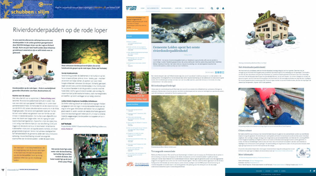 “…Ik begon net met de uitbreiding van Onder Water in Leiden, een citizen science project over het leven in de stadsgrachten. Dat wilde ik zichtbaar maken voor het grote publiek. Ik voelde toen meteen wie ik dat wilde laten realiseren en gaf Lisa opdracht voor een educatieve kleurplaat. De mooiste reactie die Lisa na publicatie kreeg, was van een bioloog: “Deze dieren zijn anatomisch correct!” Sommige vissen zelfs zo realistisch van littekens voorzien, dat wijkgenoten verheugd roepen: “Maar dit is Zeelt Tout-est-belle, en dat is Rivierdonderpad Jack Sparrow!” Ja ik geef mijn onderzoeksobjecten ook namen – dat maakt ze aaibaar voor de buitenwereld. En Lisa tekent aaibaar, laagdrempelig en met grote finesse. Ik ben dolblij dat ik met haar in zee ben gegaan! …”